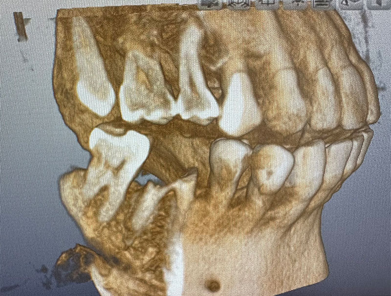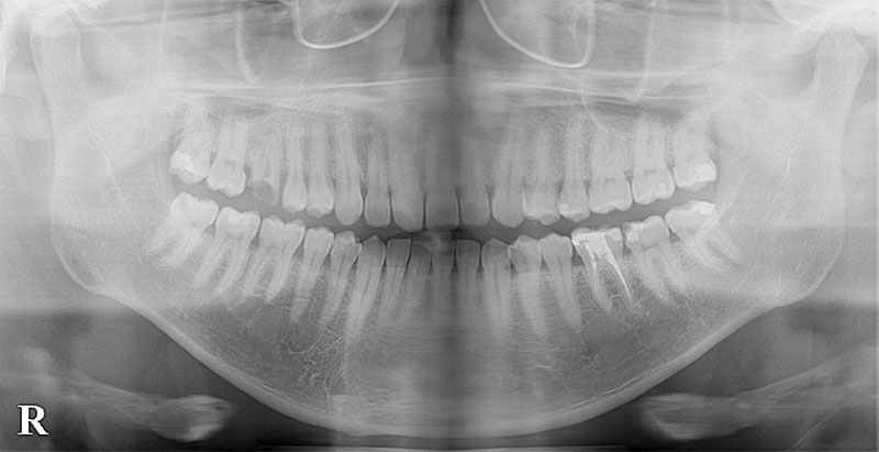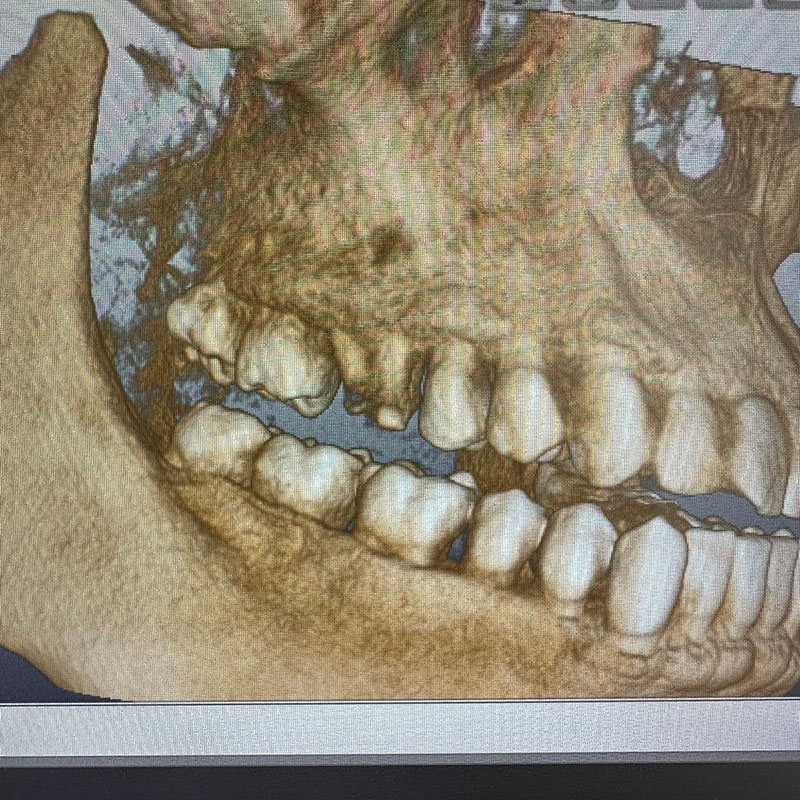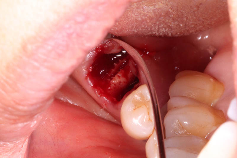 患者様は66歳、女性の方で、主訴としては右下の奥歯の治療をしたいとのことで来院されました。元々の当院に来院されたきっかけとしては、元々他院に行かれていたのですが、左右両側の親知らずの周囲の歯茎が炎症を起こし痛みを繰り返していたのですが、過去に顎が外れたことがあるらしく、そこから怖くて大きくお口を開けれないとのことでした。お口が開きにくいことから抜歯が困難とのことで他院ドクターからそのまま患部の洗浄をしながらの様子見でずっと過ごされていたとのことです。そこで当院に来院していただいてお口を見させていただいたのですが、意外とお口を開けていただくことができたので、親知らずの根っこの形態や生え方など総合的に考慮して、器具さえ入れば抜歯できると考え当院で抜歯させていただきました。抜歯の際は顎が外れないように患者様自身の手で少し押さえてもらいながら行いました。初めはとても不安そうだったのですが、案外すんなりと抜歯できたのでよかったです。そこから安心していただいたのか残りの反対の方の親知らずも抜歯しました。そして最終的には右下のインプラント治療を任せてもらうことになりました。