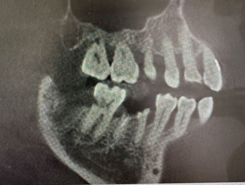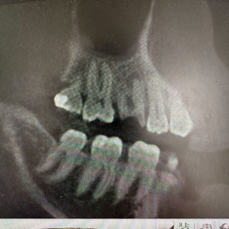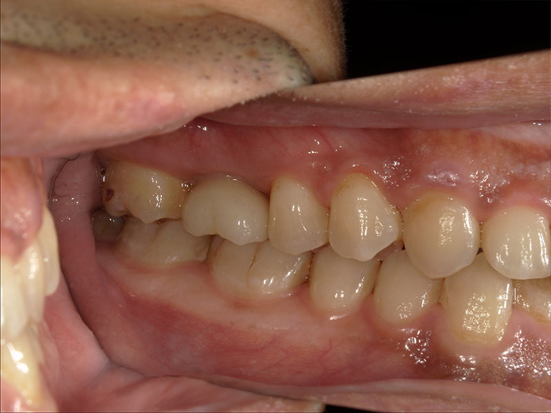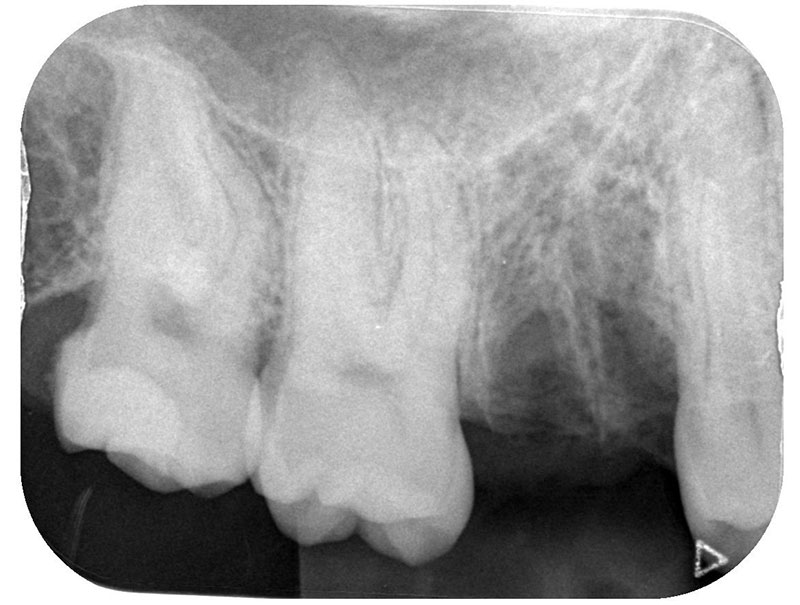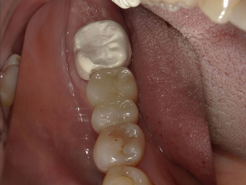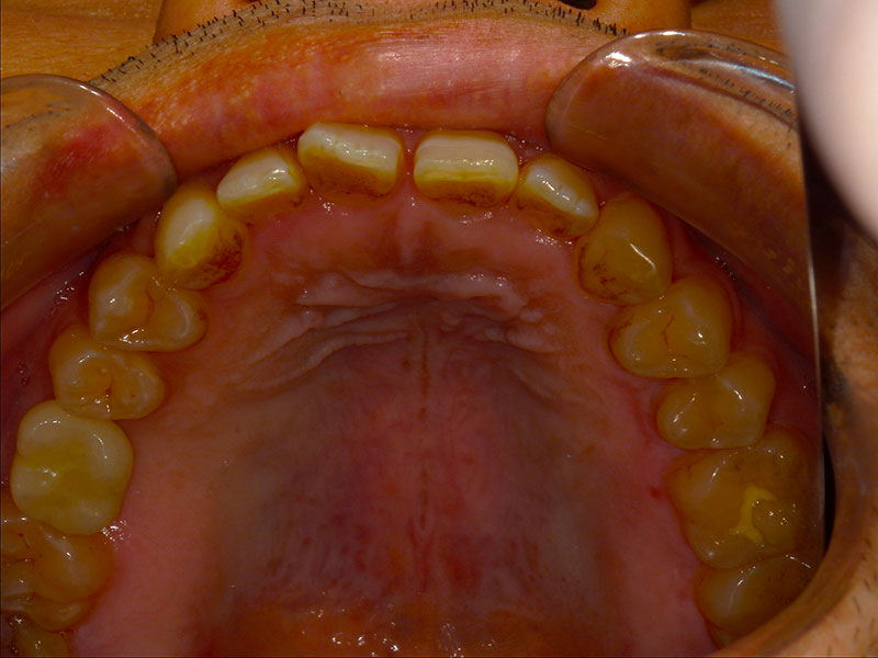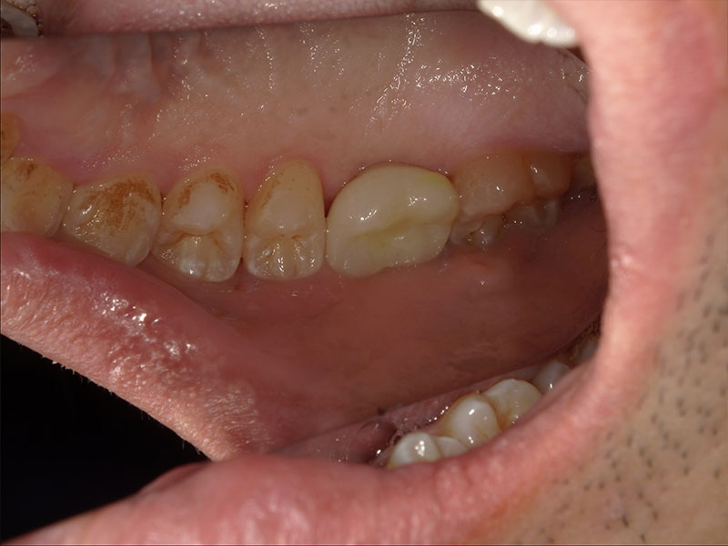 患者様は35歳、男性の方で、主訴としては患者様から何か訴えるということはなかったです。元々を言えば、他の歯の治療やクリーニングで来院されていたのですが、口腔内を診察させていただきましたところ、右上の奥歯(右上6)が崩壊していて、根っこだけの状態であったのですが、特に痛みなどはなくずっと放置していたとのことでした。私から食事をする時など食べにくくないか聞いたところ、ずっと前から気になっていて今回を機会に治療したいとの申し出がございました。