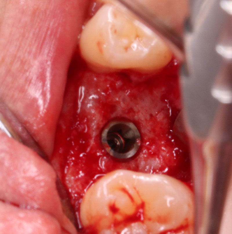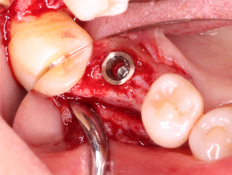 インプラントの埋入に関しては1回法で行いました。抜歯した部位の骨はしっかりと治癒していました。インプラント埋入後はヒーリングキャップを装着しました。手術時は特に大きな問題はなく無事に手術が終了しました。インプラントの露出を避けるためにも骨幅が少しでも広いところに埋入するために理想的な位置よりは少し後ろになっています。
