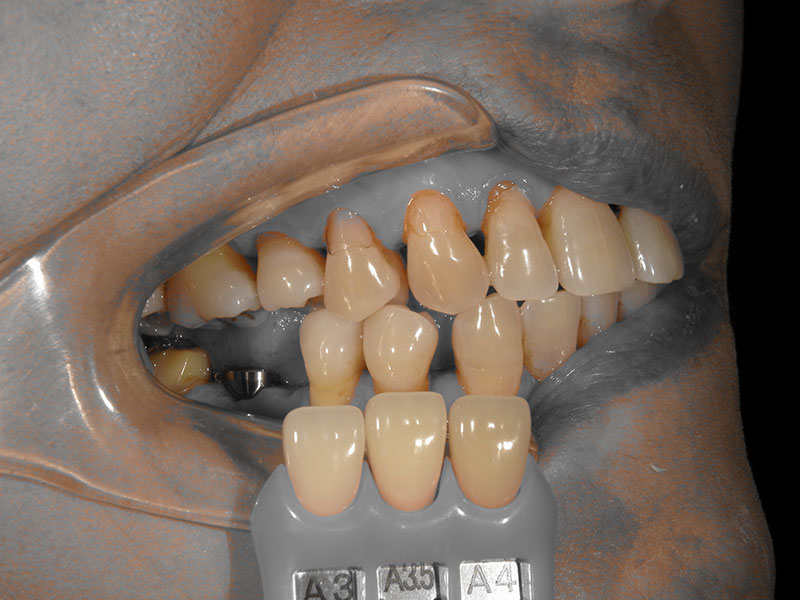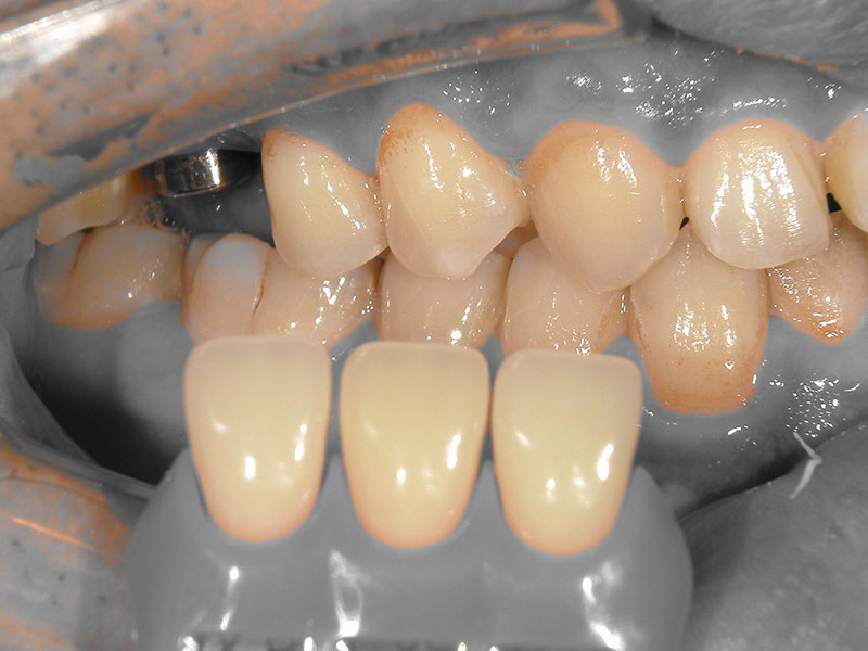 インプラント埋入後におよそ3ヶ月後にインプラント部の型取りとシェード採取を行います。クローズドトレー法という方法で行いました。