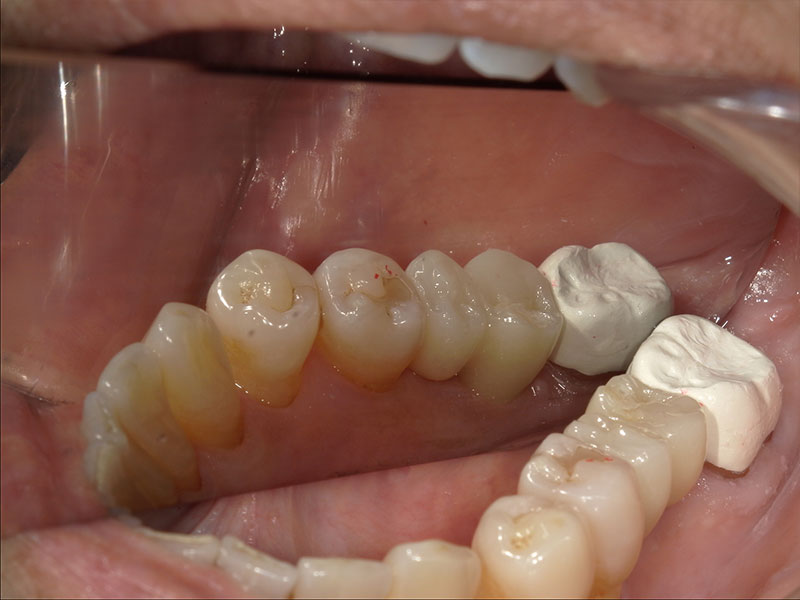 インプラントの上部構造を装着しました。インプラント部の清掃性を考え、小臼歯が2つ並んだような形態にしました。こちらの形態の方が歯間ブラシが通しやすくインプラントが長持ちします。