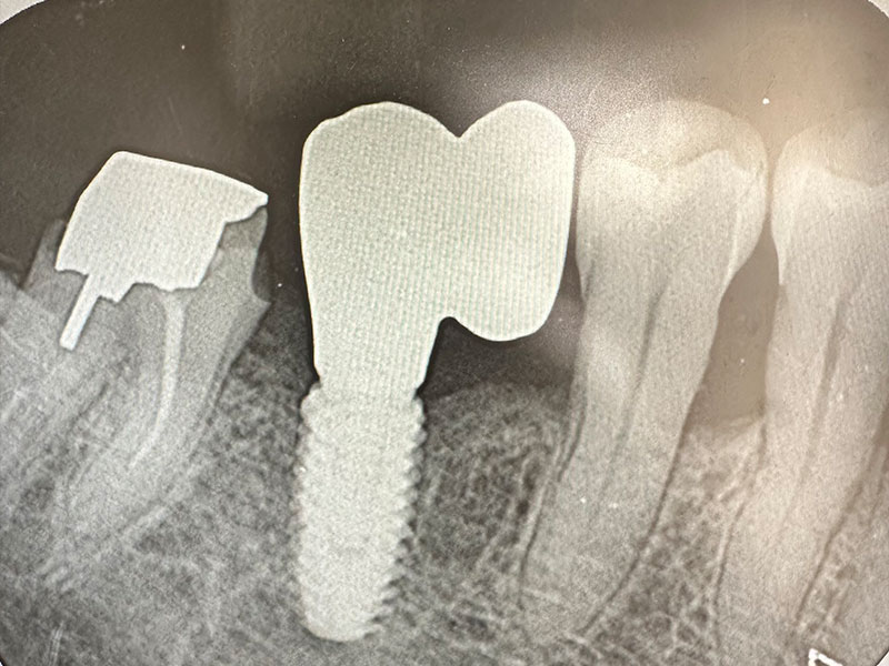 インプラントの上部構造と言って、インブラントの「歯」に核当する部分を装着しました。隣在歯との歯にも調和しています。患者様にも咬みやすいと喜んでいただくことができました。