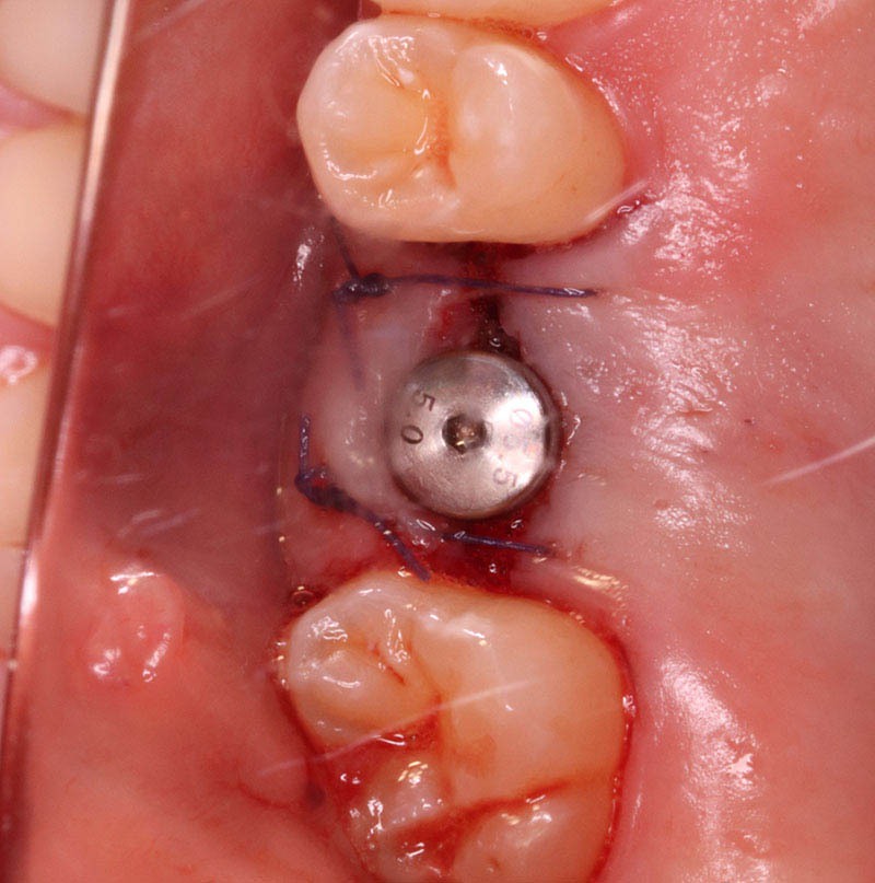 インプラントの埋入に関しては1回法で行いました。抜歯した部位の骨はしっかりと治癒していました。インプラント埋入後はヒーリングキャップと言ってインプラント周囲の歯茎の形態を整えるためのキャップを装着しました。手術時は特に大きな問題はなく無事に手術が終了しました。